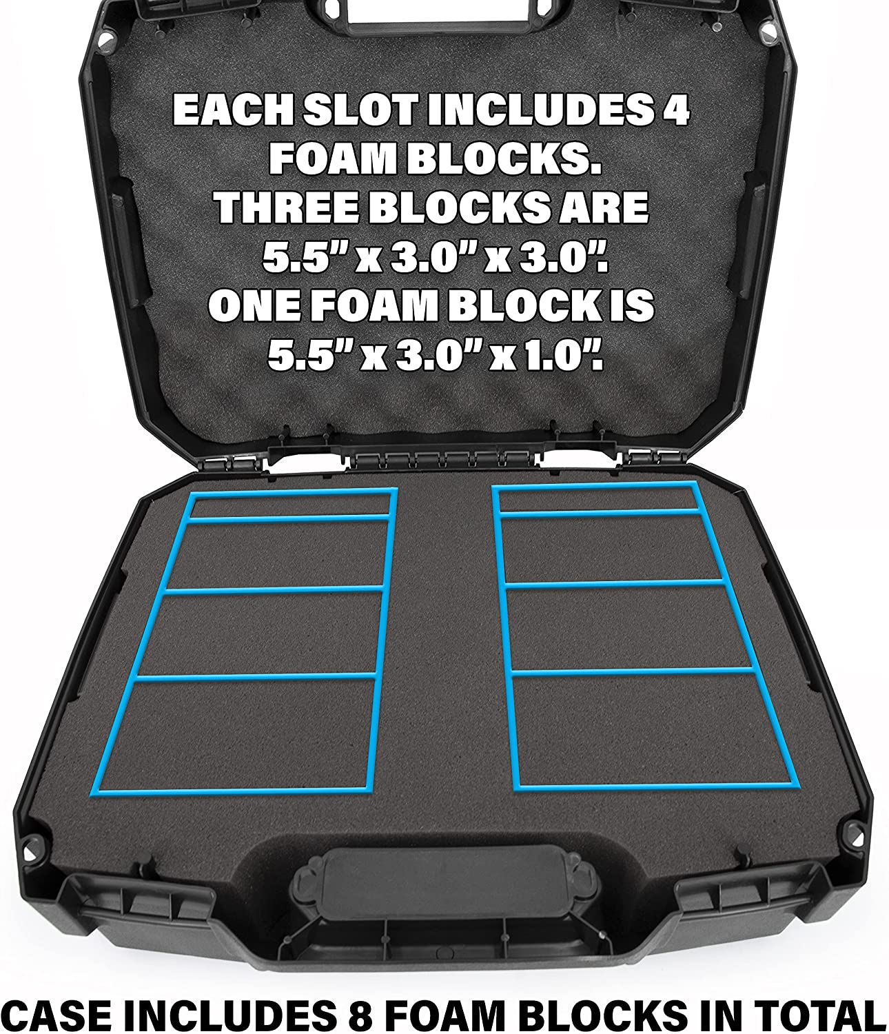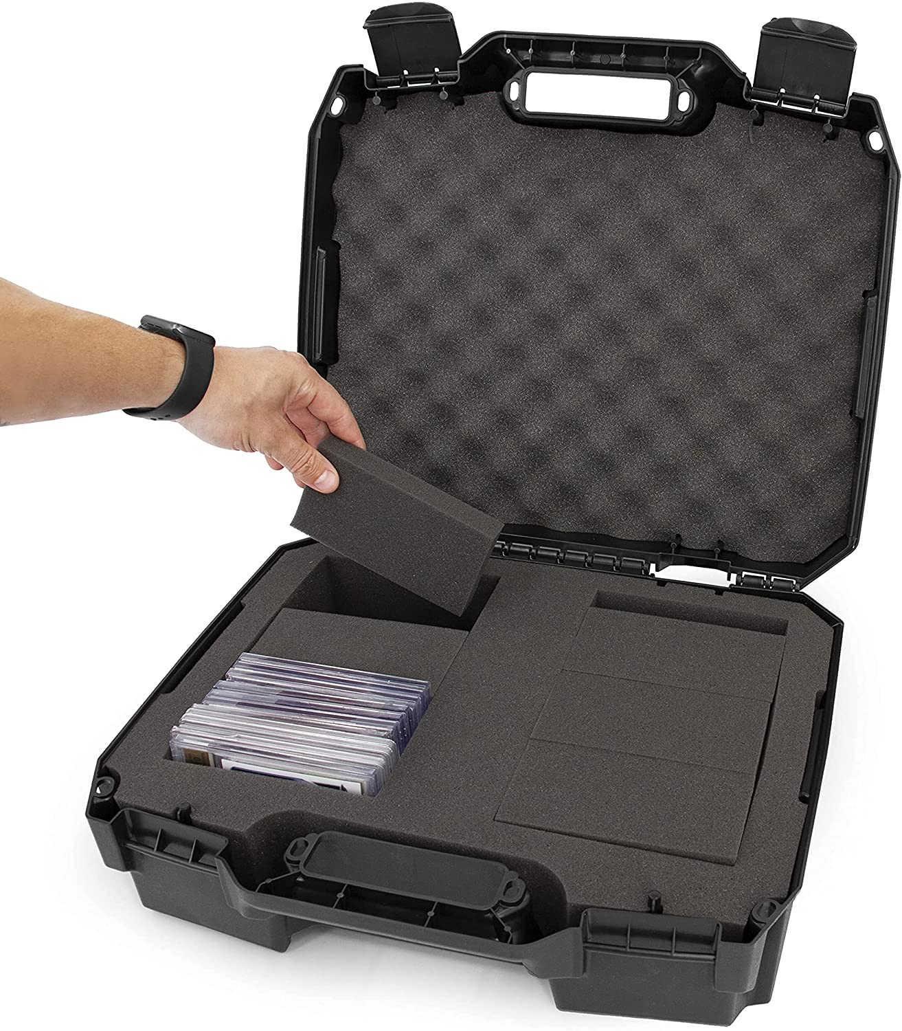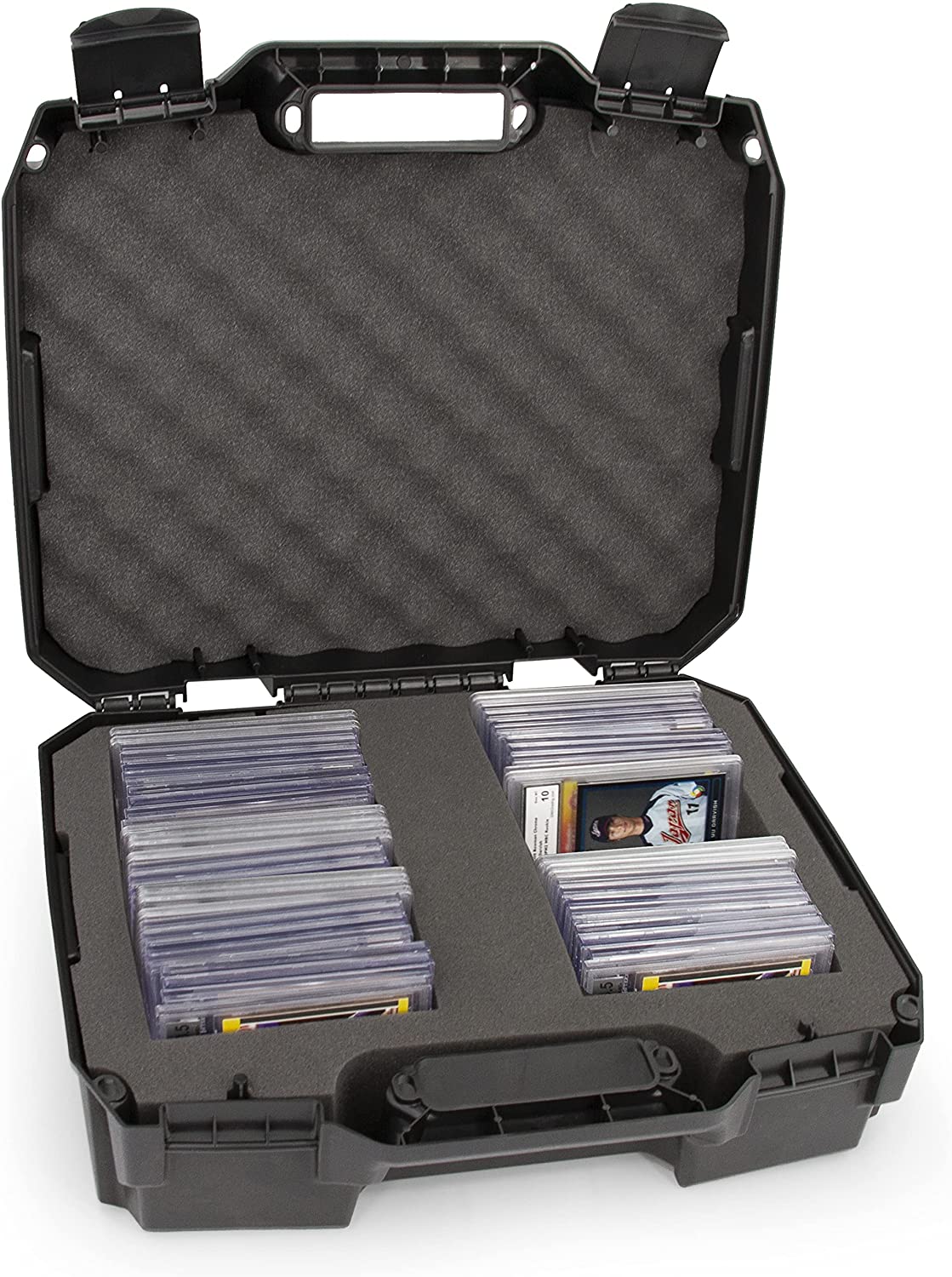 • Dual Horizontal Storage System: Custom trading card case foam interior with two impact-absorbing sports card case slots designed to store graded sports slabs horizontally, featuring dual card case slots measuring 9.5" x 5.5" x 3.5" each with 8 removable graded sports card holder foam blocks to separate cards.