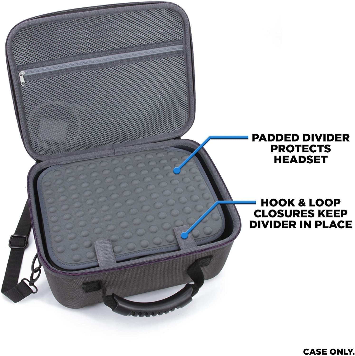 • Padded Interior Divider System: Padded interior divider secured via two hook and loop connectors keeping your headset and controllers secured in main compartment during transport, adding layer between accessories stored on underside of lid and your headset/controllers in main compartment.
