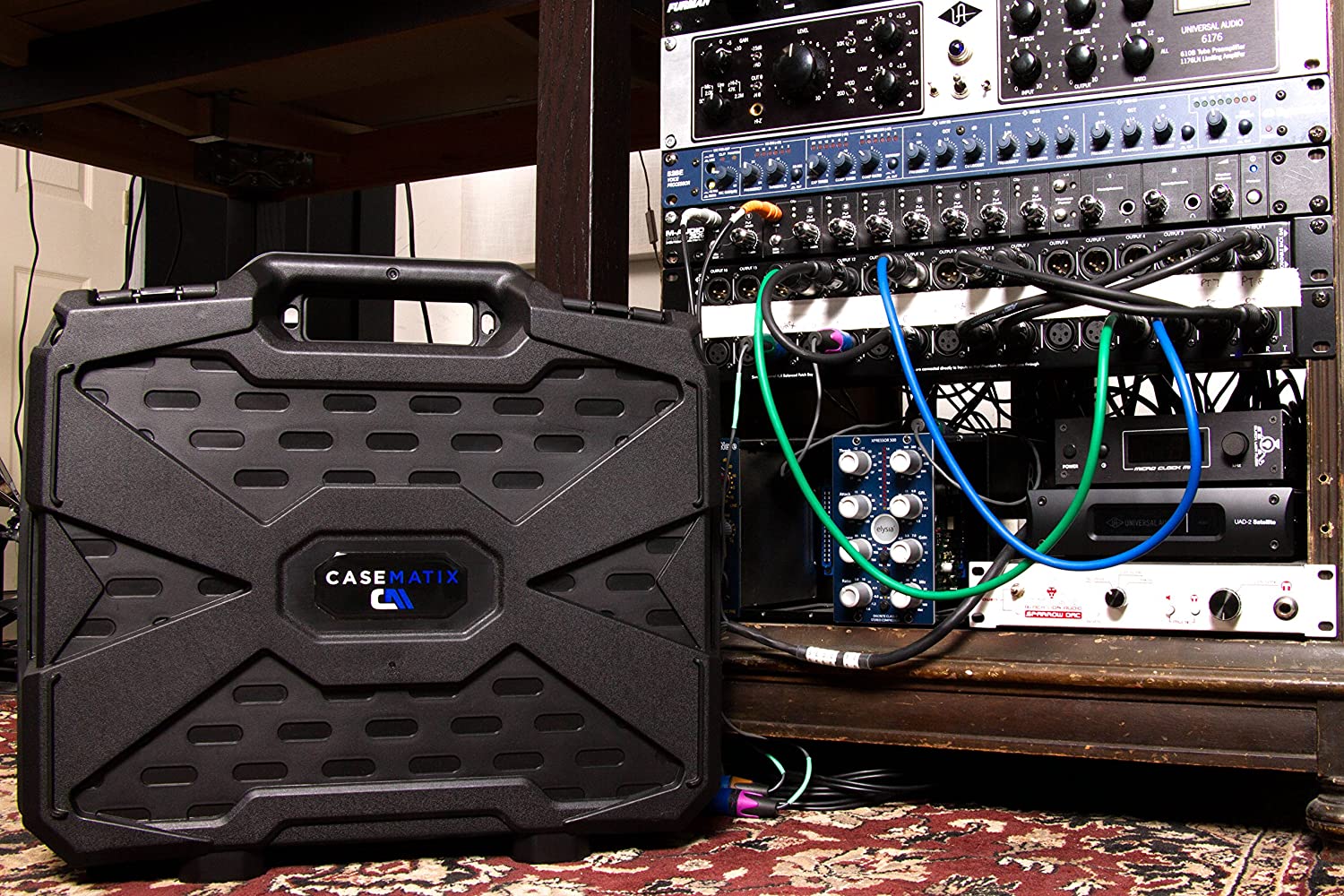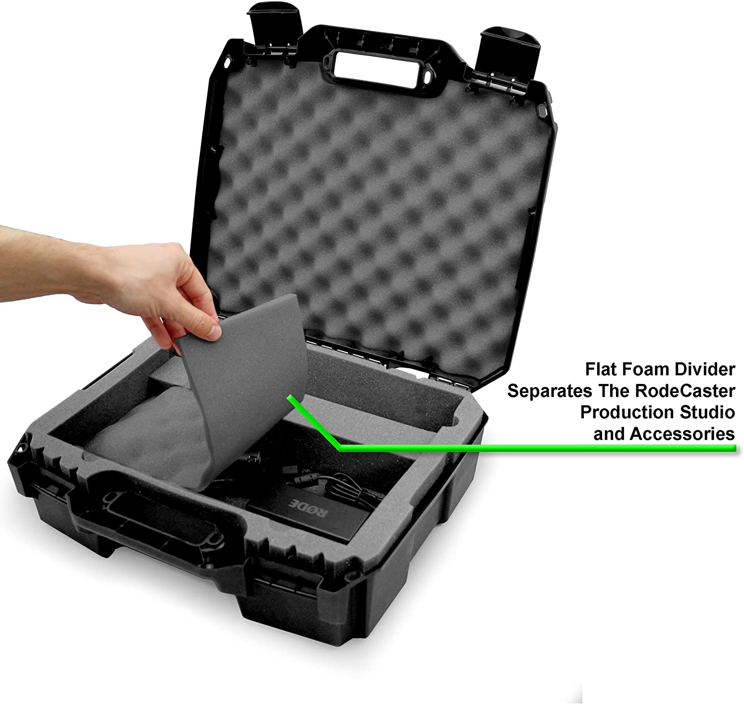 • RodeCaster Pro Podcast Equipment Protection: Crushproof 17" impact-resistant mixer audio case compatible with podcast mixer and podcast kit accessories, protecting your valuable podcaster, microphones, and audio mixer with ultra-durable hard polymer composite plastic exterior construction.• Precision-Cut Impact-Absorbing Interior: Dense impact-absorbing protective foam precision-cut for podcast production studio mixers with thick egg-crate foam top and pre-cut layer perfectly fitting your recording interface, microphone, and accessories - even knobs and buttons are protected.• Custom Foam Compartment System: Custom foam compartments snugly holding your device in place surrounded by dense padding on all sides, with bottom accessory compartment measuring 13.5" x 5" x 2" for mic and cables with included divider for complete organization.• Travel-Optimized Professional Design: External dimensions of 16" x 13" x 6" with comfortable carry handle creating perfect solution for conveniently carrying your podcast audio mixer equipment and accessories, featuring briefcase-style design ideal for travel.• Made in USA Premium Construction: Includes warranty against defects with dual quick-snap latches securely closing case, two optional padlock holes, reinforced design protecting from dust, drops, and scratches, plus smooth opening long-lasting hinges for lifetime durability.