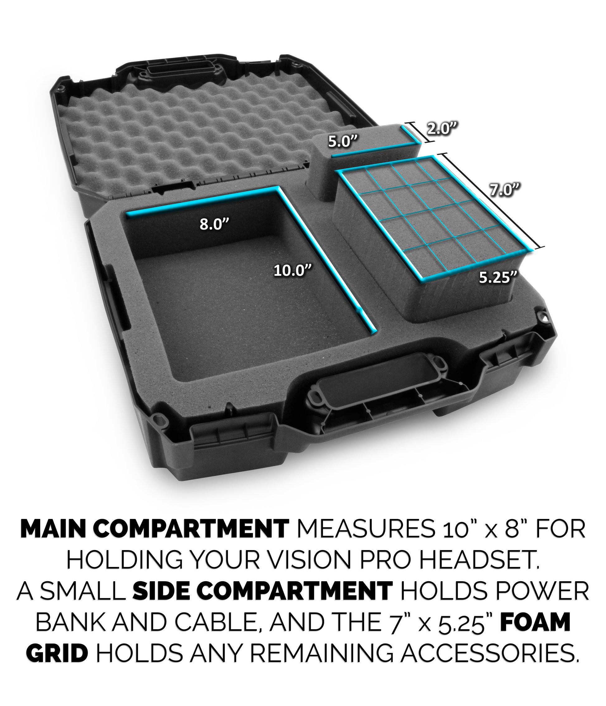 • Made in the USA With Custom Storage Solutions: The middle layer features a custom-cut foam tray that perfectly accommodates your VR headset, external battery, charging accessories, adapters, aftermarket headbands and more. Also includes a 1" x 1" compartment cut out for adapter and charging cable storage. Case only - Vision Pro not included.