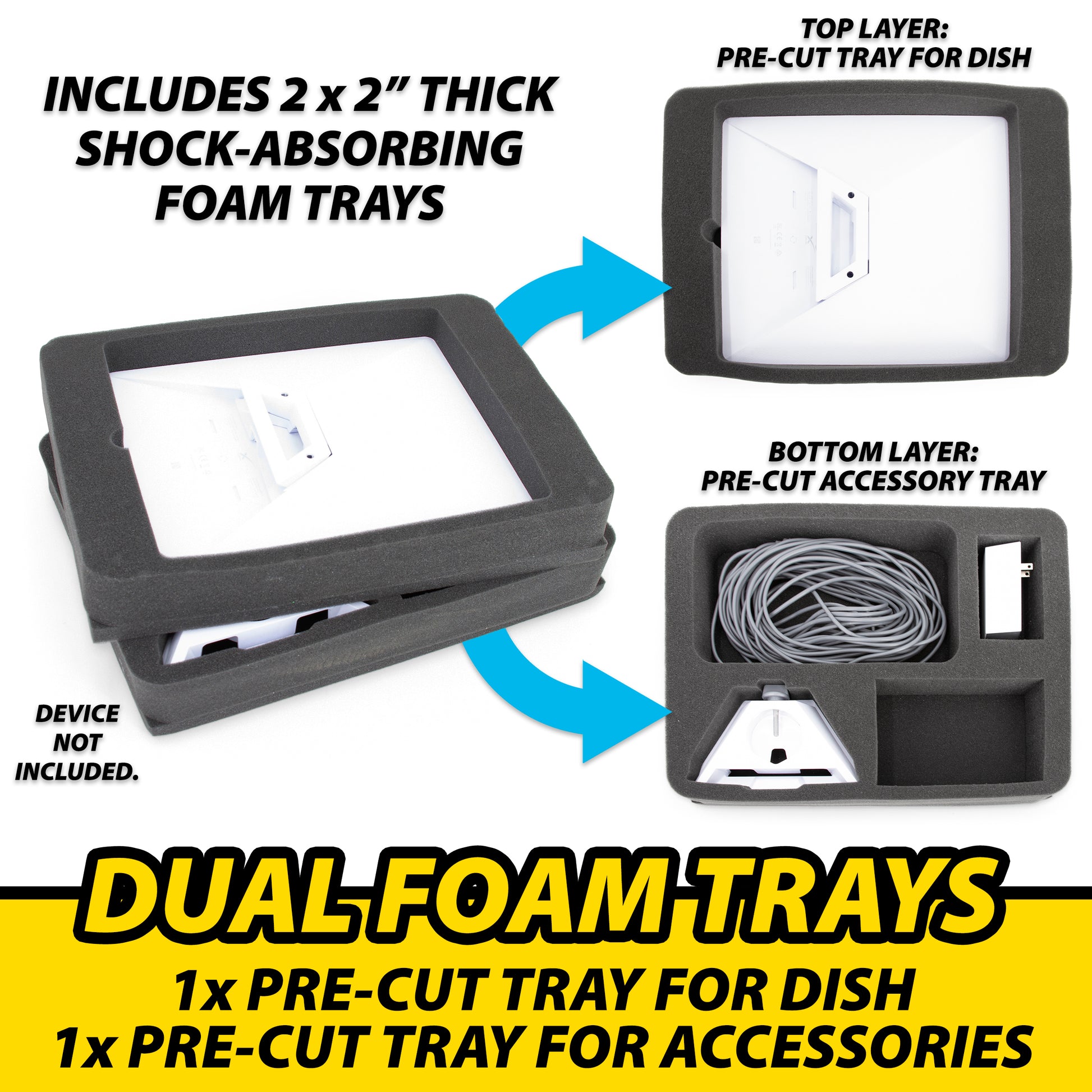 - [PRECISION CUT FOAM WITH DUAL LEVEL STORAGE]: The top removable foam tray compartment firmly holds the dish. The bottom tray has pre cut compartments to hold the pipe adapter, cables and two separate pluck foam areas for additional accessories